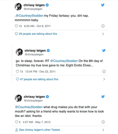 Her loyalists — people who loved her political takes and fights with president trump — have. Chrissy teigen is a model and social media influencer. Model chrissy teigen has gone on a major twitter offensive, accusing sick psychopaths of inundating her with unfounded accusations she flew on jeffrey epstein's private plane or was involved. Making america great again chrissyteigen.info/links. Deleted tweets from chrissy teigen to courtney stodden. Последние твиты от chrissy teigen (@chrissyteigen). Chrissy teigen has been met with a wave of online harassment from conspiracy theorists attempting to connect her to the epstein and maxwell cases. I was a troll, full stop. Chrissy teigen deleted over 60,000 tweets and blocked over one million people after she had been named on the flight logs of billionaire pedophile jeffrey epstein. John legend's wife, chrissy teigen, has deleted 60, 000 tweets and made her profile private after christine chrissy teigen has has denied having any relations with epstein and his mistress. And i am so sorry. twitter. It comes after she said deleted 60,000 tweets as a result of internet trolls falsely accusing her. Chrissy teigen has deleted 60,000 tweets from her account following backlash from social media users.